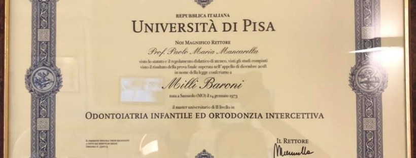 Ora sono ancora più pronta per i vostri bimbi, grazie al Master di Secondo Livello in odontoiatria infantile e ortodonzia intercettiva conseguito all’Università di Pisa.